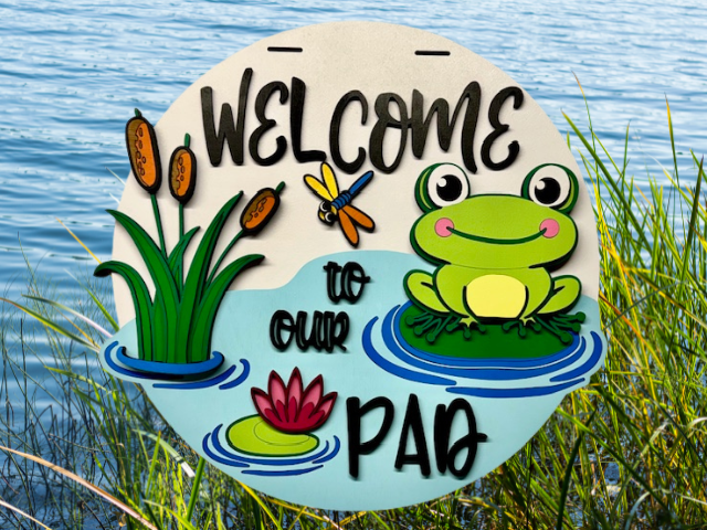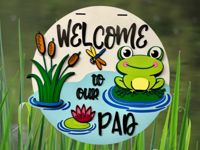 3D laser cut wood welcome sign with a neon green frog sitting in a pond surrounded by lily pads and grass, featuring the phrase "Welcome to Our Pad"Welcome to Our Pad Frog Sign