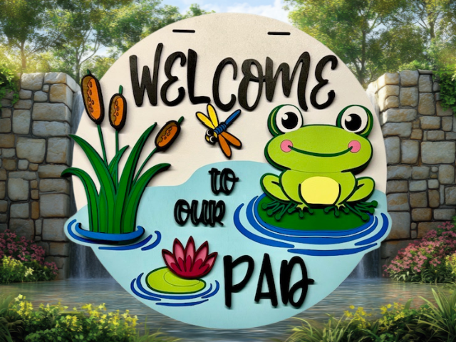 Bring a pop of playful charm to your space with this 3D laser-cut “Welcome to our Pad Frog Sign”. Featuring a bright neon frog surrounded by lily pads, pond details, and layered grass, this design creates eye-catching depth and texture. Perfect for front porches, patios, garden rooms, lake houses, or frog lovers everywhere, this sign adds personality and a lighthearted touch to any space!